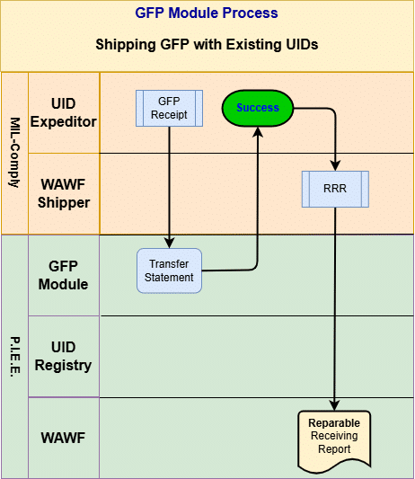 The PIEE GFP Module performs numerous tasks managing government property that is temporarily in possession of contractors, going far beyond just UID-marked items. Its intersection with the MIL-Comply footprint, however, is limited to the management of contractor custody of UID-marked items provided to contractors for servicing of some type. During this process the contractor takes custody of such items via the GFP Module returning custody via the WAWF Reparable Receiving Report.