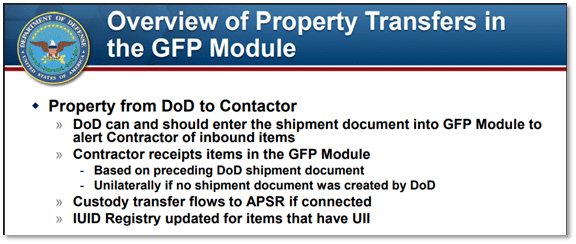 Prior to introduction of the GFP Module contractors transacted directly with the IUID Registry to acknowledge custody of items. In January 2025, the DOD began strict enforcement of DFARS 252.245-7005 requiring use of the GFP Module for the management of contractor custody requests. Part of its purpose is to ensure that contractors are authorized to have specific GFP items.