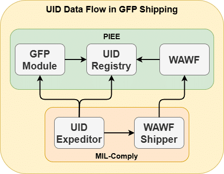 This requires automated systems such as MIL-Comply to transact with both the GFP Module and the IUID Registry. These systems use different data channels and transaction standards, however, UID Expeditor makes the process as seamless as possible, coordinating the actions of the two systems. For more information, see GFP Module Automation.